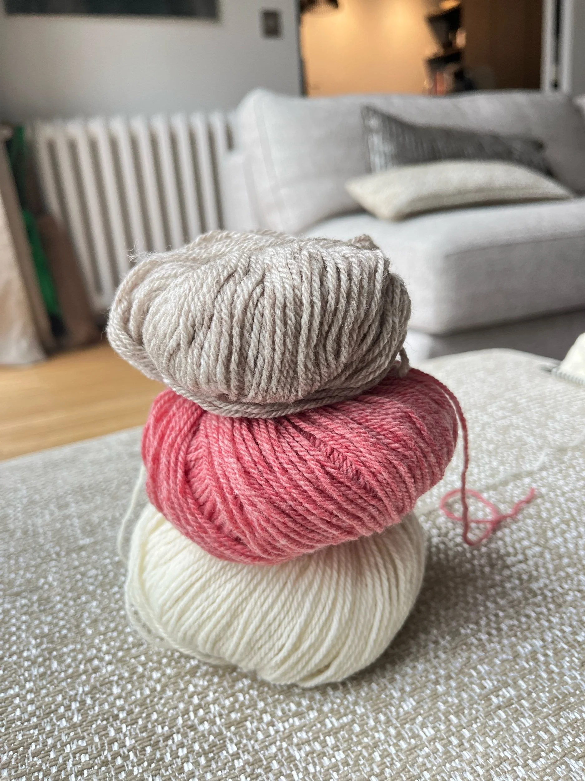 Fil Tartan 3 Fonty (50 g, 140 mètres) 3 3 3 3 pelotes (1 de chaque coloris). Mes coloris Coup de Coeur : Ecru (2022), Beige (2023), Rose (2007, Bleu ciel (2010), Bleu foncé (2012)